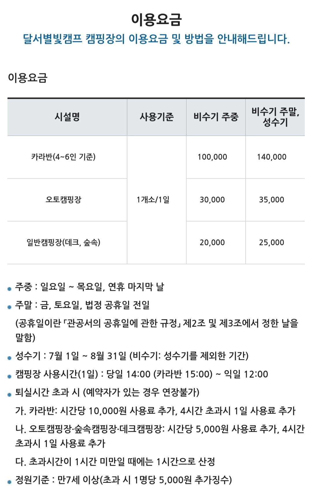 <달서별볓캠핑장 이용 요금 안내>
