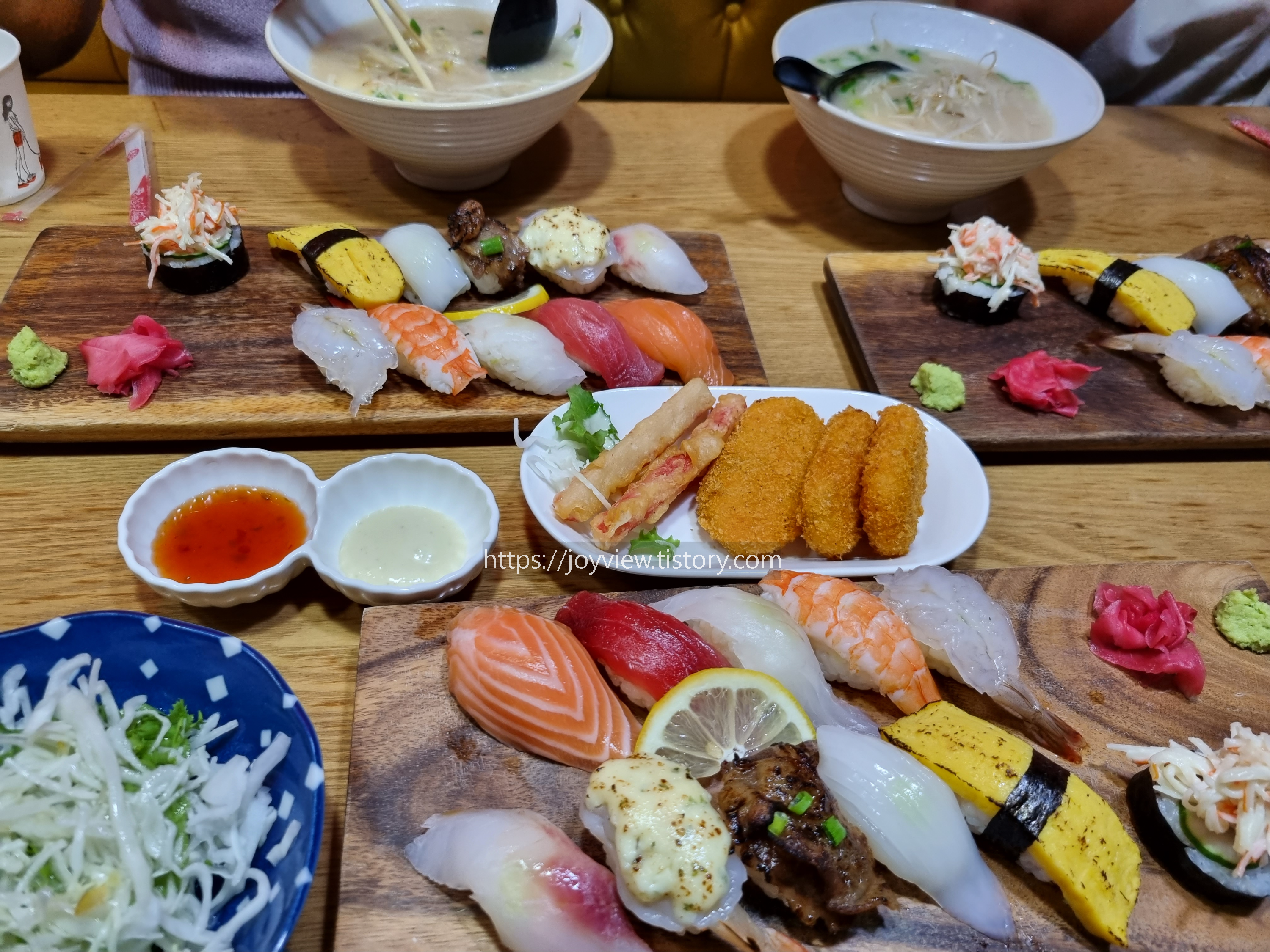 인당 모듬초밥 10개, 면 메뉴, 미니연어 샐러드, 감자 고로케이다.